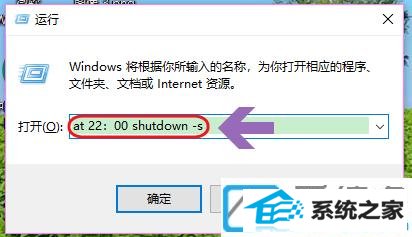 第四步:上述这种定时关机是通过倒计时的方式来进行。有些小朋友不想计算,想在固定的某个时间点关机,可以使用命令为:at 时间 shutdown -s,比如说想要在晚上十点整关机,运行窗口输入“at 22:00 shutdown -s”直接