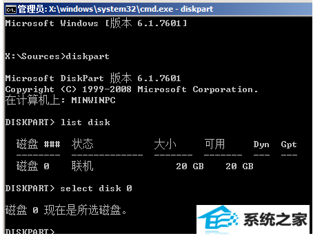 第四步:输入:select disk 0,按回车键。选择第0个磁盘(电脑的硬盘编号是从0开始的)