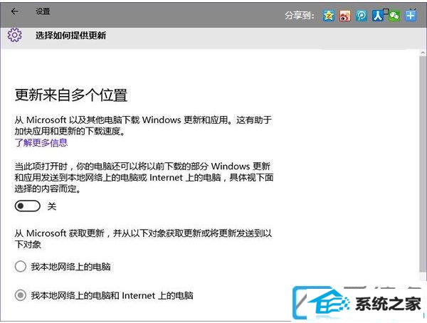 第二步:同时按住【win+i】打开【配置】窗口,依次点击:升级和安全----win升级----高级选项-----选择怎么提供升级。点击【升级来自多个位置】下的按钮,位于关上状态。