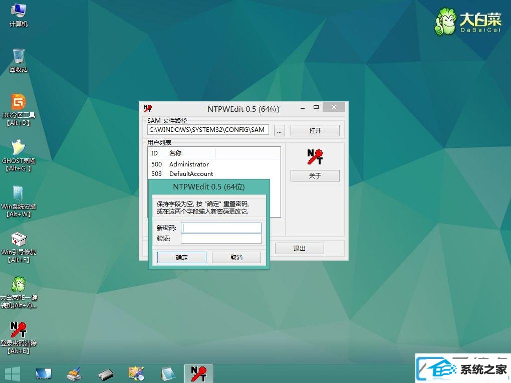 第五步:弹出这个小对话框,看提示,如果放空白,即可点击确定,便是重置密码,即删除密码;如果要改密码,输入新密码并验证就行了;
