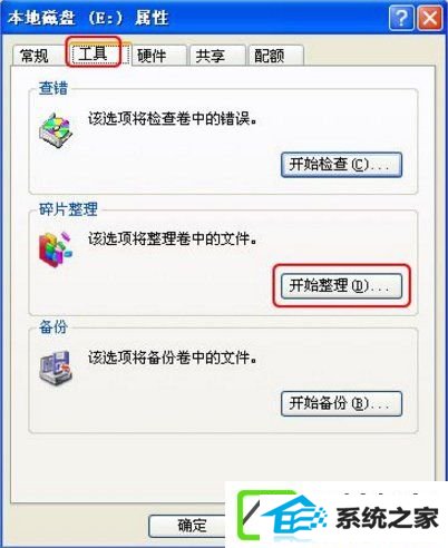 第二步:在打开的界面里选工具项,再选择工具界面里磁片整理,鼠标选择开始整理项,如下图所示: